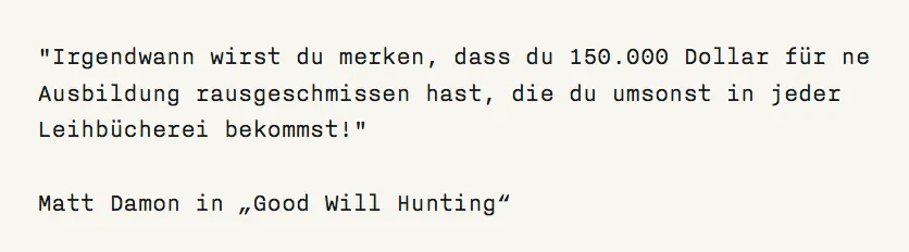 Zwar weiß jeder, der einmal eine Hochschule von innen gesehen hat, dass die Kursinhalte nur einen Teil des Studiums ausmachen, dennoch bieten die als Online-Studium konzipierten Kurse tolle Möglichkeiten. Zum einen, weil sie zeit- und ortsunabhängig belegt werden können, vor allem sind aber viele der Angebote vollkommen kostenlos. Durch die Gratis-Bildung kann nun auch ein Hilfsarbeiter aus Mumbai Vorlesungen beim gleichen Spitzenprofessor hören, wie ein Elite-Student in den Elfenbein-Unis der USA - ein stark demokratisierender Effekt. Und je stärker der Trend wird, desto eher werden sich auch hierzulande Professoren einem Wettbewerb in ihrem eigenen Fach stellen müssen, denn Studierende werden sich „ihren Stoff woanders besorgen“, wenn der eigene Prof. zu gelangweilt auftritt.